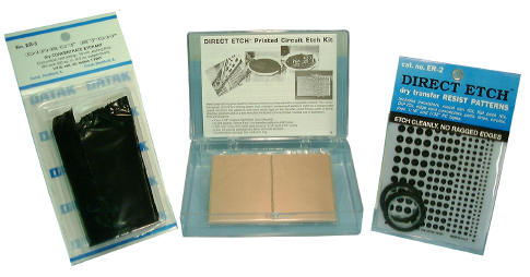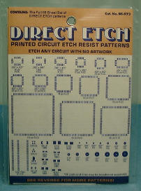 © copyright 2003 LKG Industries Inc. What is DIRECT ETCH? Also referred to as "DE", the product group consists of patterns that can be rubbed down (burnished) onto either a copper laminated PC board, or onto clear film or paper to create a PC board circuit pattern. These patterns are "dry-transfers" that provide not only tidy donut pads for component leads but, more important, provide exact spacing that will match the IC’s, transistors and other components that you will use in your electronic circuit. Why DIRECT ETCH? Creating a simple