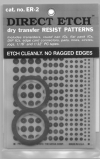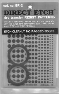 The no. ER-2 kit contains 8 sheets of patterns in a mixed assortment (good for most small circuits) and two rolls of the DE tape, one 1/16" and one 1/32" wide. Includes patterns for IC’s and plenty for resistors, diodes, capacitors and other two-lead components. And, it’s easy to use the included patterns to make PC board patterns for ‘odd’ components too. Order part no. ER-2 Kit